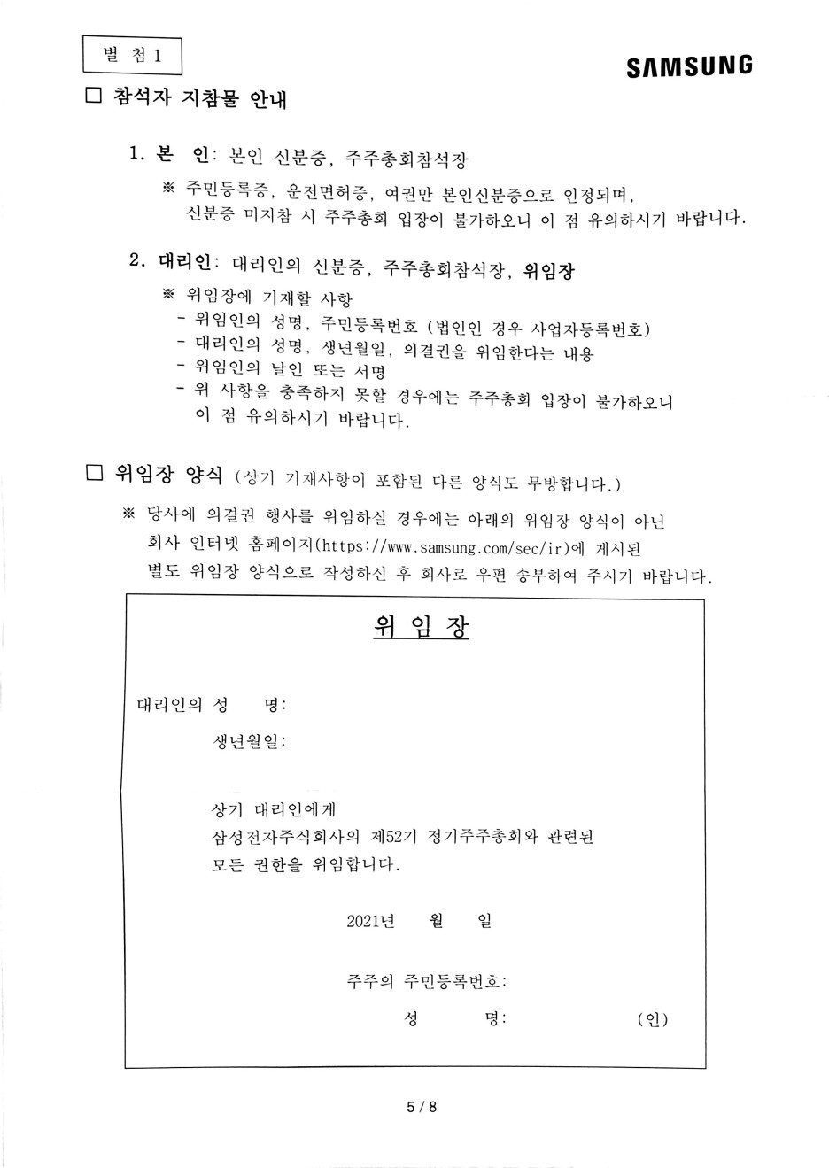제가 유일하게 보유하고 있는 국내주식은 삼성전자인데 배당금통지서는 온라인으로 변경이 되었기 때문에 어떤 내용인지 궁금해서 뜯어보니 주주총회참석장이였습니다^^