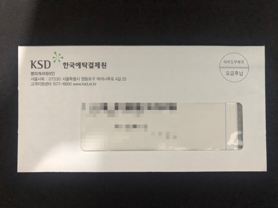 오늘 퇴근하고 집에 돌아왔는데 한국예탁결제원에서 한통의 편지가 도착해있었습니다.