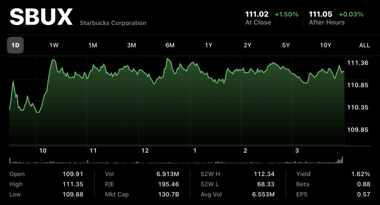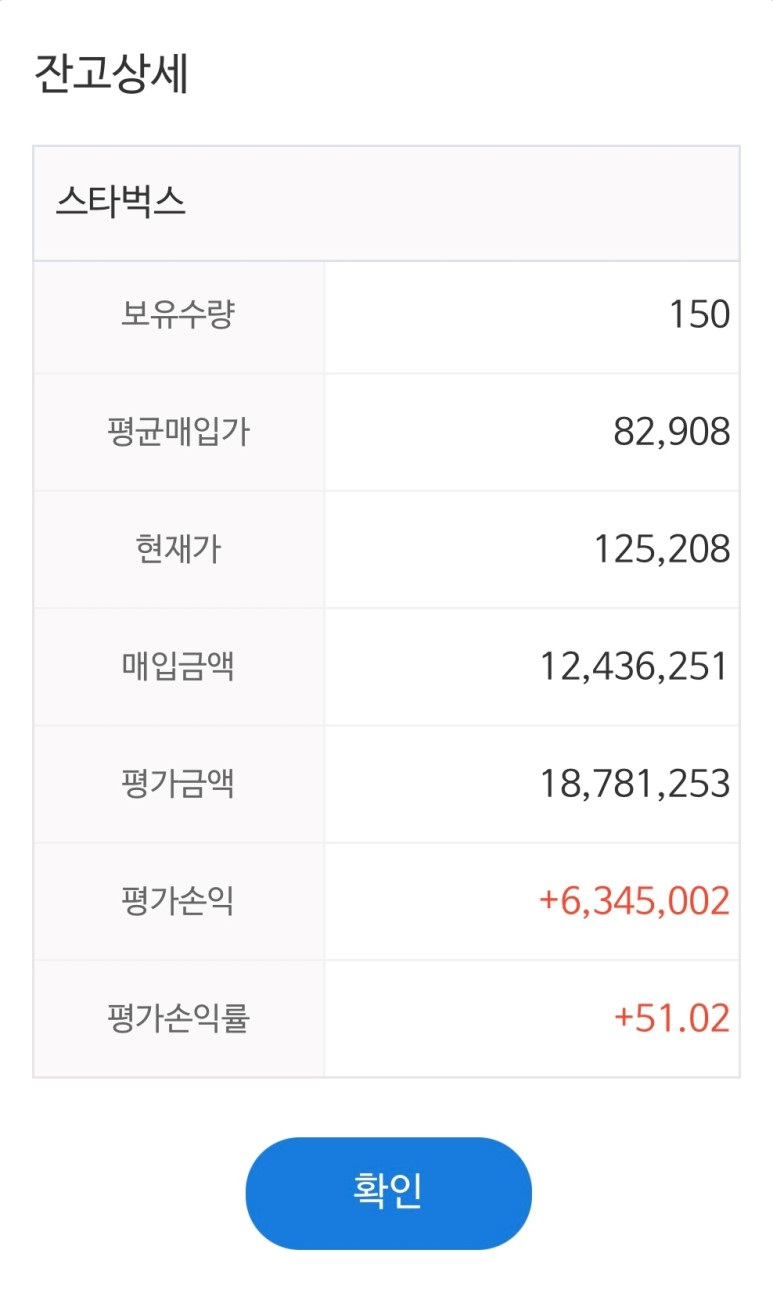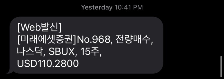 어제 저녁 미국장이 열리고 스타벅스 주식을 주당 $110.28에 총 15주를 매수를 하여 총 스타벅스 보유주식이 150주로 증가하였습니다^^