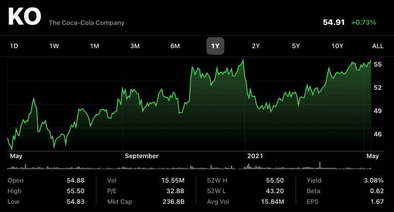 2021년 5월 11일 기준으로 코카콜라 수익률은 13.54%이며 분기기준으로 코카콜라 주식 1주당 $0.42의 배당금이 지급됨으로 분기별로 $86.1의 배당금 수령이 가능해졌습니다^^