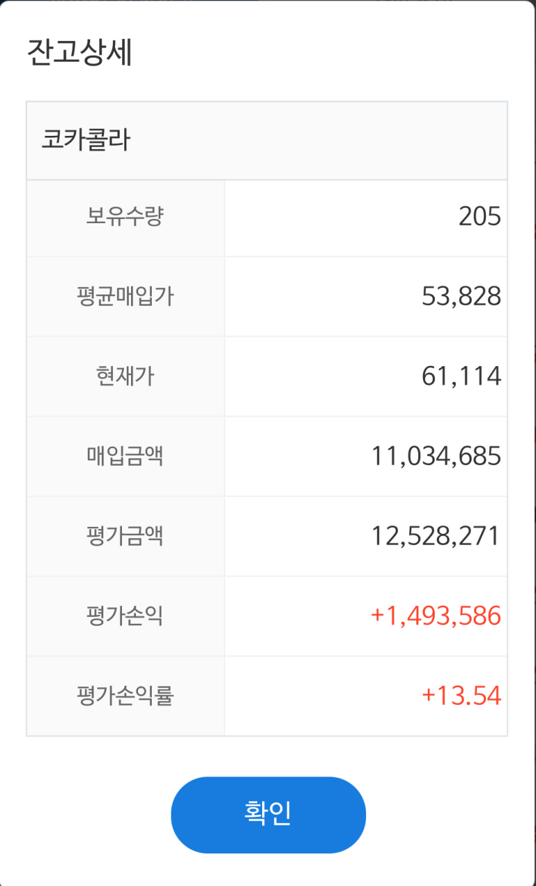 이번 매수로 총 코카콜라 보유주식이 205주로 증가하였습니다^^