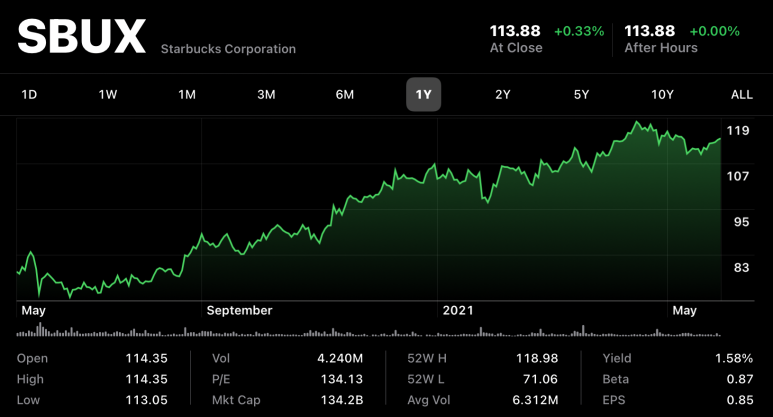 2021년 5월 31일 기준으로 스타벅스 주가는 주당 $113.88이며, 배당금은 1.58%로 주가가 올라서 배당률이 줄어든 것을 감안하더라도 배당금이 많은편은 아니지만 매년 배당금을 지속적으로 올려주고 있고