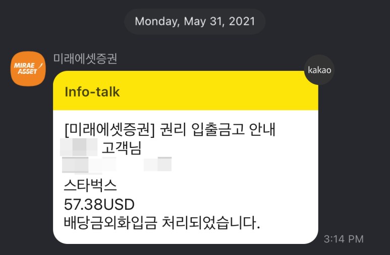 오늘 오후 2021년 두번째로 스타벅스로부터 배당금을 수령했습니다~^^