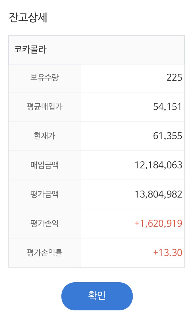 2021년 6월 2일 기준으로 코카콜라 수익률은 13.3%이며