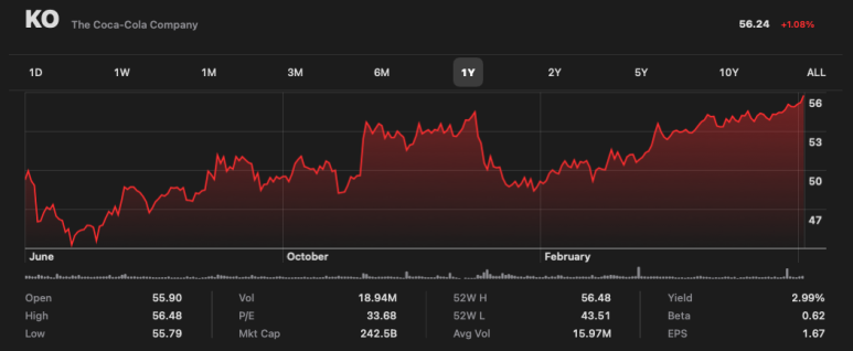 2021년 6월 7일 기준으로 코카콜라 수익률은 13.54%이며