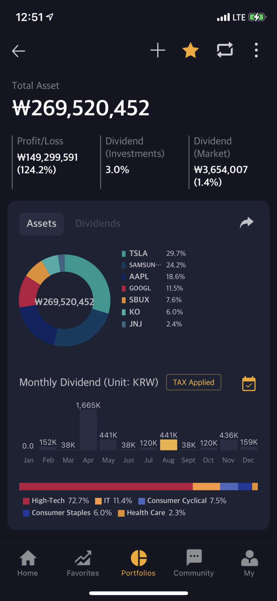 현재 포트볼리오 비중의 큰부분인 테슬라와 구글에서 배당금 지급을 안하고 있기 때문에 전체 배당금 %가 낮지만 전체자산 사이즈를 증가시키기 위해서는 성장주도 포함이 되어야 하기 때문에 당분간은 매도를 하지 않으면서 배당 월급날 배당주 위주로 매수하는 전략으로 움직이고 있으며