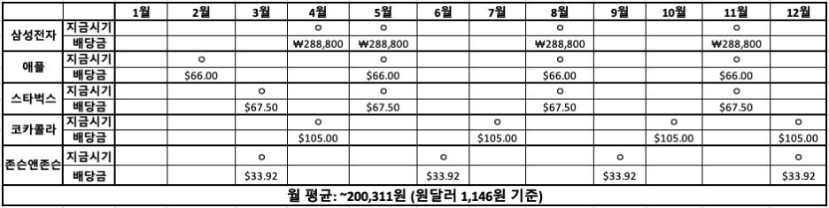 2021년 8월에는 삼성전자, 애플, 스타벅스에서 배당금을 받을 예정이며, 존슨앤존슨을 신규편입 및 추가매수를 하여 배당금을 늘리면서 포트폴리오를 조정하고 있습니다.