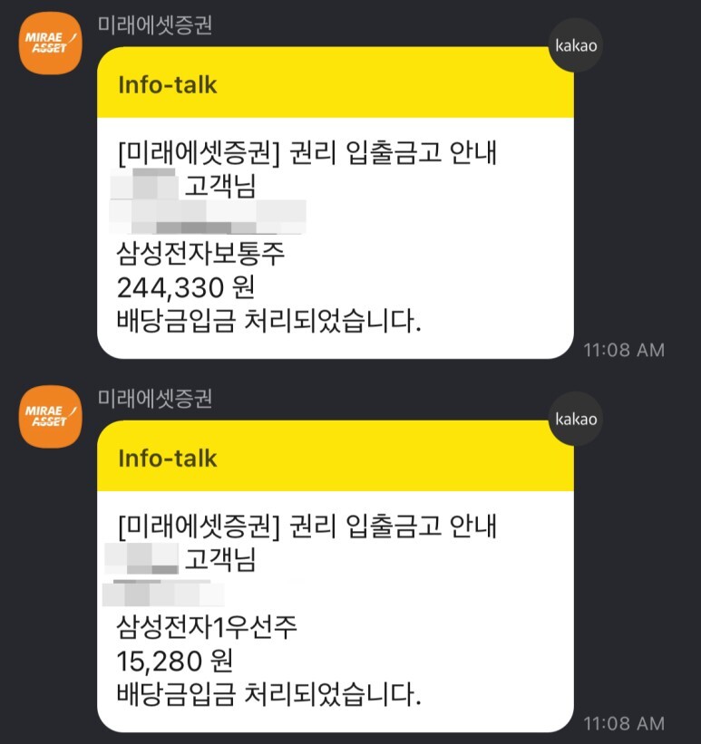 현재 저는 삼성전자 800주, 삼성전자우 50주를 보유 중이여서 세후 기준으로 삼성전자는 244,330원, 삼성전자우는 15,280원이 입금되었습니다^^