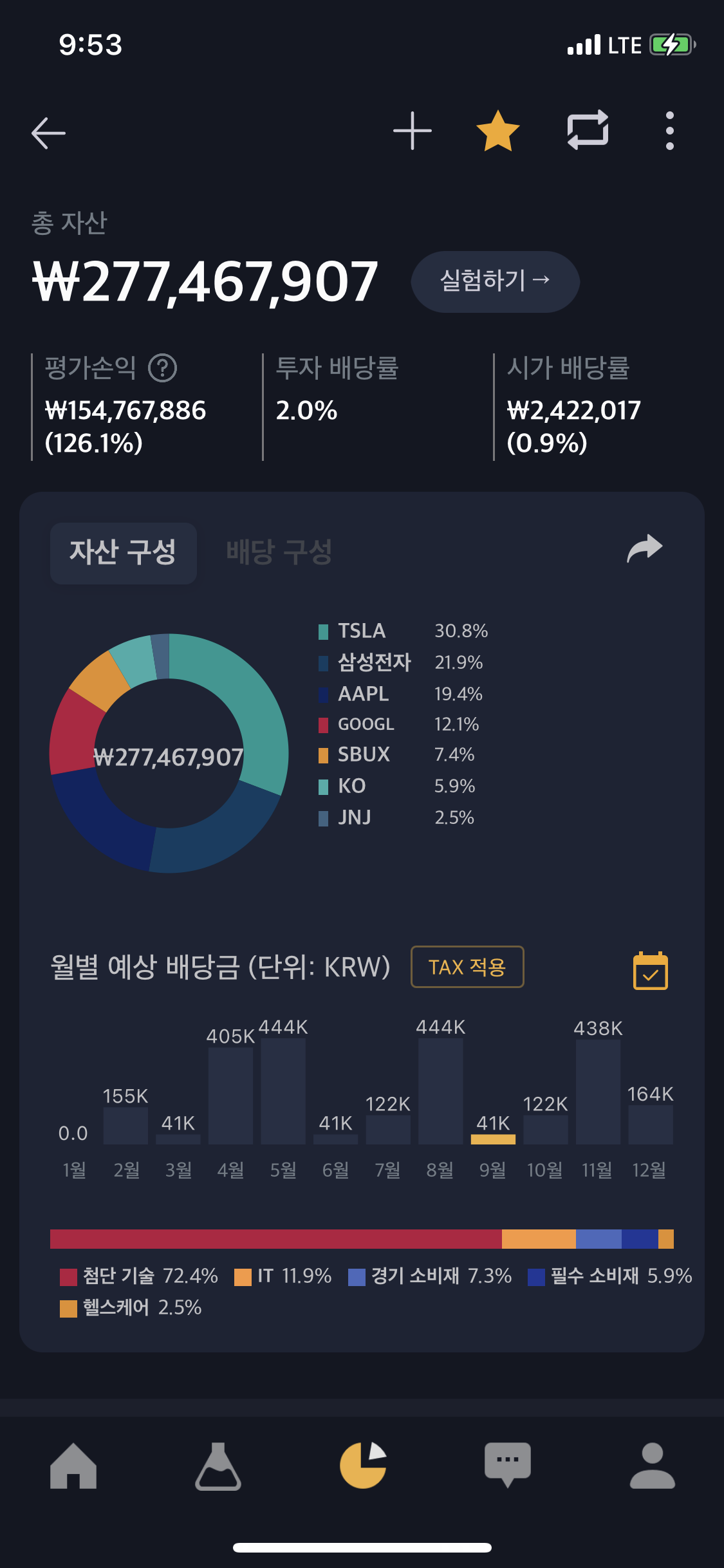 현재 포트볼리오 비중의 큰부분인 테슬라와 구글에서 배당금 지급을 안하고 있기 때문에 전체 배당금 %가 낮지만 전체자산 사이즈를 증가시키기 위해서는 성장주도 포함이 되어야 하기 때문에 당분간은 매도를 하지 않으면서 배당 월급날 배당주 위주로 매수하는 전략으로 움직이고 있습니다.
