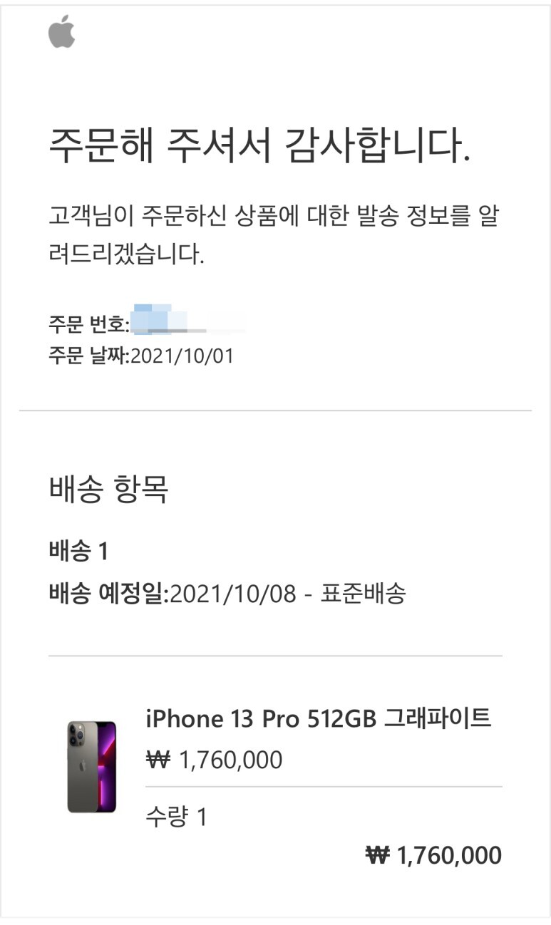 10월 1일이 되자마자 애플 공홈에서 아이폰 13 프로 512GB 그래파이트를 1,760,000원에 구매를 하였고