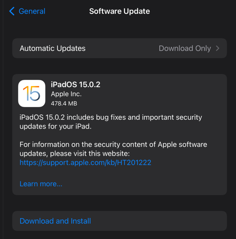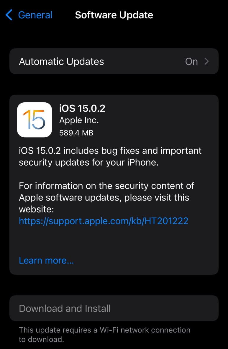 아이폰은 iOS15.0.2, 아이패드는 iPadOS15.0.2버전으로 업데이트 크기는 약 500~600MB이며