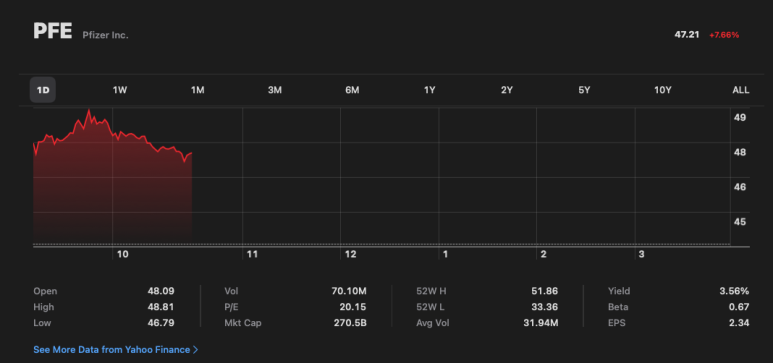 자기전 심심?해서 미국주식이 어떤지 확인을 하던 도중 화이자가 약 7~10% 주가 급등을 확인했습니다.