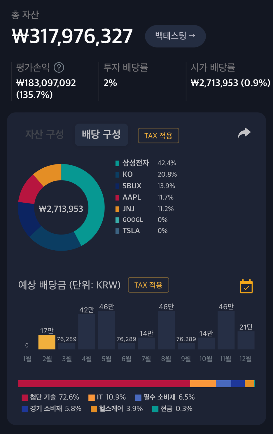 현재 포트볼리오 비중의 큰부분인 테슬라와 구글에서 배당금 지급을 안하고 있기 때문에 전체 배당금 %가 낮지만 전체자산 사이즈를 증가시키기 위해서는 성장주도 포함이 되어야 하기 때문에 2021년에는 배당주 위주의 매수를 진행하여 연간 배당금 수령금액을 약 270만원으로 증가시켰습니다.