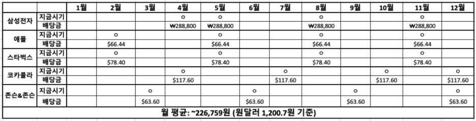 2020년 7월 8일에 처음으로 제가 보유하고 있는 종목, 투자 기준, 그리고 다달이 현재 보유하고 있는 주식을 기반으로 매달 얼마의 배당금을 받을 수 있는지 알아봤었고 변동사항이 있을때 마다 업로드를 하고 있습니다^^