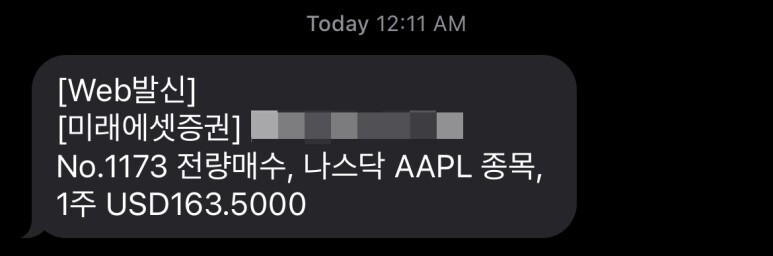 어제 저녁 미국장 시작전에 애플 주식을 $163.5에 1주 매수예약을 하고 자고 일어나보니 주문이 체결이 되어 있는 것을 확인하였습니다 ^^