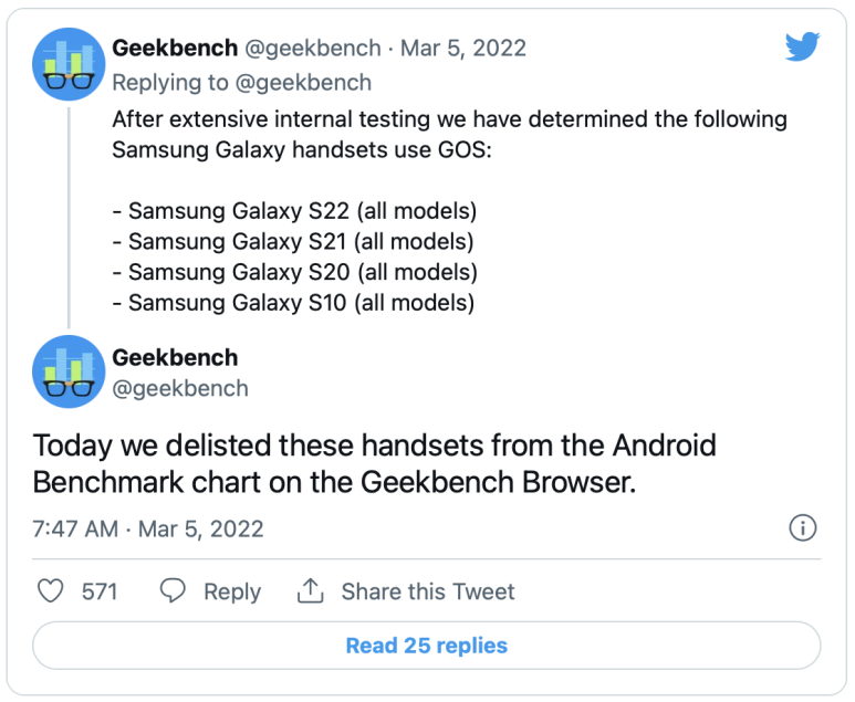 이에, 밴치마크의 대표중 하나인 Geekbench에서는 이러한 행위는 정당하지 못한 것으로 간주하여 GOS가 작동하는 모든 갤럭시를 밴치마크 기기 리스트에서 제외하기로 했습니다.