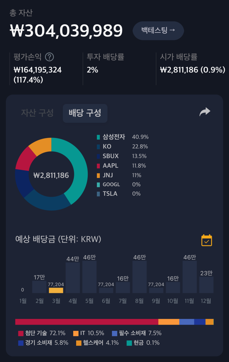 현재 포트볼리오 비중의 큰부분인 테슬라와 구글에서 배당금 지급을 안하고 있기 때문에 전체 배당금 %가 낮지만 전체자산 사이즈를 증가시키기 위해서는 성장주도 포함이 되어야 하기 때문에 2021년부터 배당주 위주의 매수를 진행하여 연간 배당금 수령금액을 약 280만원으로 증가시켰습니다.