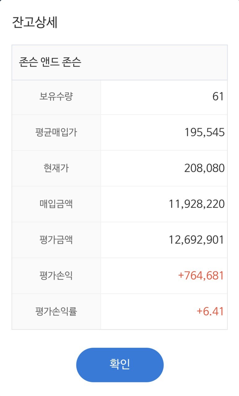 2022년 3월 12일 기준으로 존슨앤존슨 수익률은 6.41%이며 (포트폴리오 리벤런싱 이후 기준)