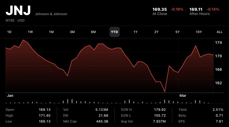 2022년 3월 10일, 존슨&존슨을 $168에 1주 매수를 예약하고 다음날 일어나 보니 매수가 채결된 것을 확인하였습니다~
