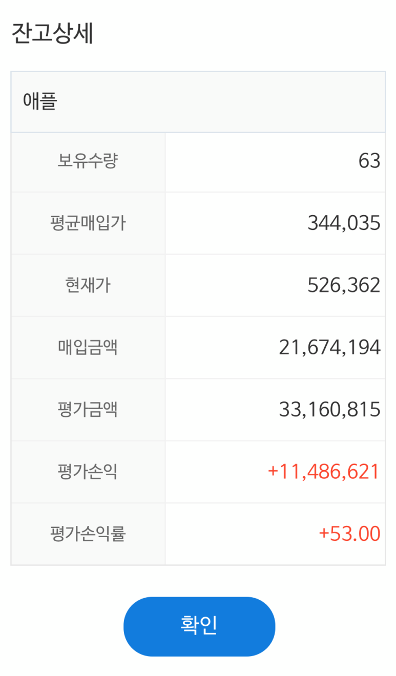 작년 11월부터 꾸준히 매수한 제 애플 주식의 가치는 2020년 8월 8일 기준으로 53% 상승하였습니다.