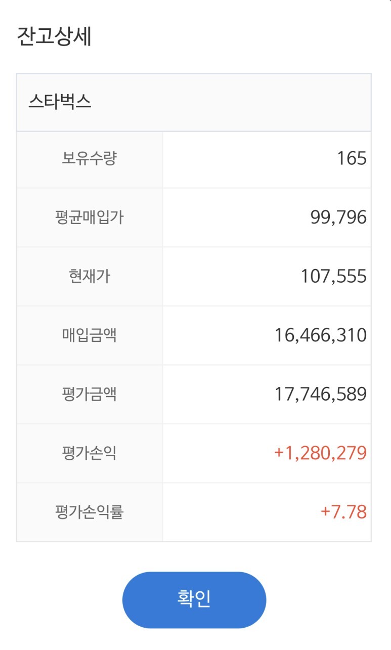 아무튼 2022년 3월 17일 기준으로 스타벅스 수익률은 7.78%이며 (리벨런싱 이후 기준)