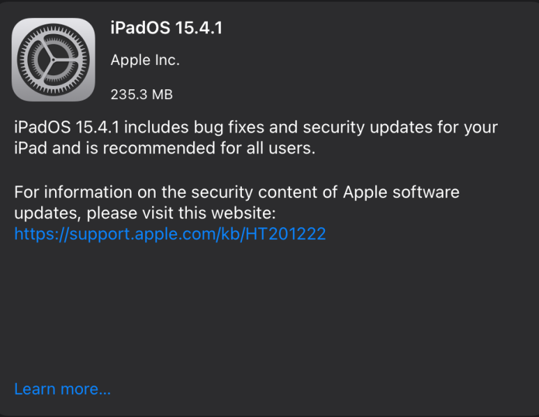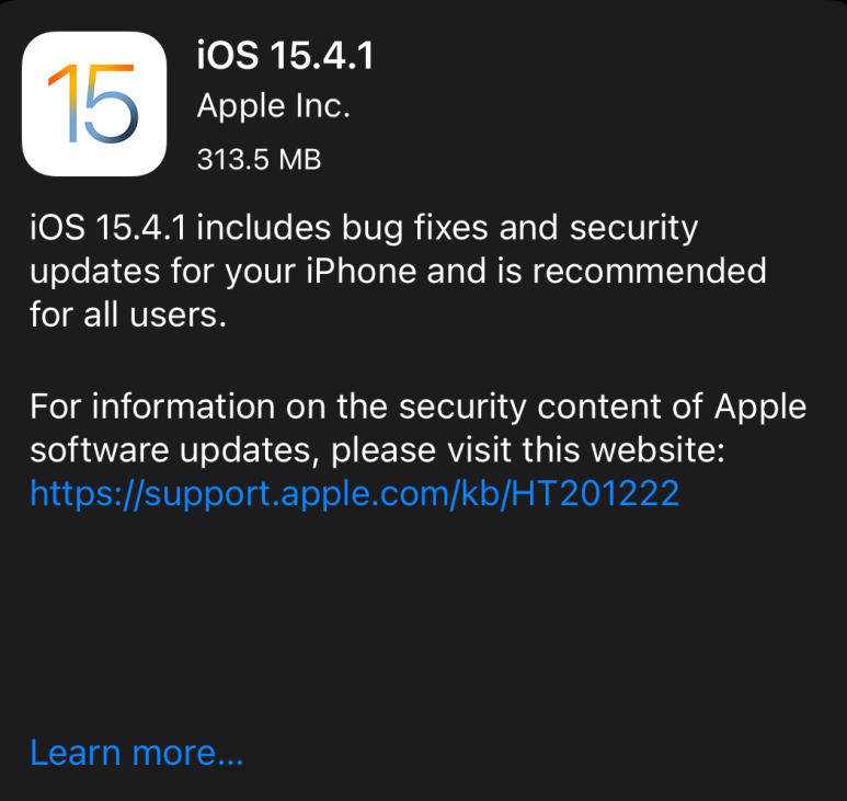 아이폰은 iOS15.4.1, 아이패드는 iPadOS15.4.1 버전으로 업데이트 크기는 313.5MB (아이폰13프로 기준), 235.3GB(아이패드 프로 1세대 11인치 기준) 이며 애플워치 WatchOS 8.5.1는 약100MB(애플워치 4세대 기준)입니다.