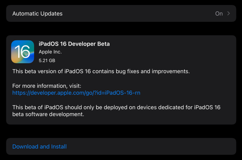 (2018년 아이패드 프로 11인치 기기 기준으로 iPadOS 16 배타 설치용량은 약 5.2GB입니다)