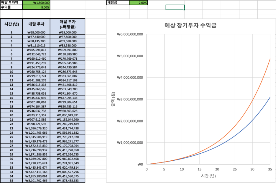 이며 엑셀에 계산을 해보면 매달 150만원씩 투자하고, 연 수익률 8%을 유지하며, 배당금 2%를 지급받고 그 금액을 그대로 재투자하면, 30억을 모으는데 필요한 시간은 30년으로 계산이 됩니다.
