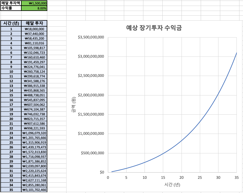 이며 엑셀 계산 결과 매달 150만원씩 연 8% 수익률을 유지하면 30억을 모으는데 필요한 시간은 34~35년입니다.