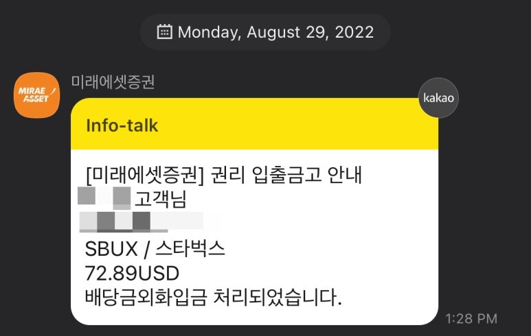오늘 오후 2022년 세번째로 스타벅스로부터 배당금을 수령했습니다~^^v