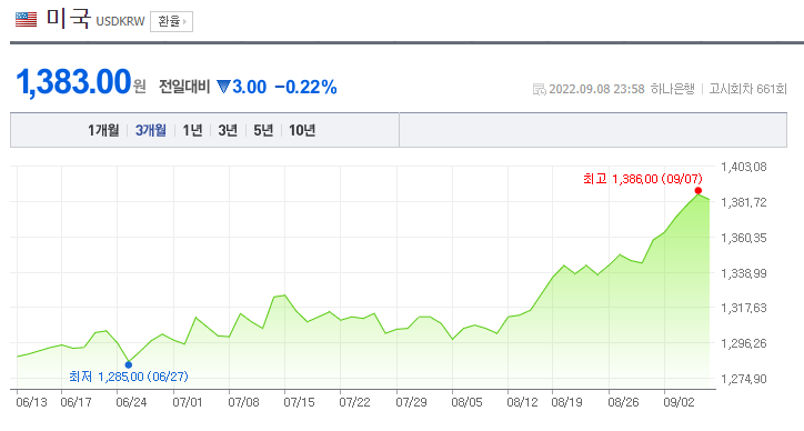 미국, 유럽, 우리나라의 금리인상 시나리오, 우리나라 기업상황 그리고 세계상황을 고려하였을 때 현재 1383원의 환율이 역사적으로 빠르고 가파르게 올라갔기 때문에 환차손을 볼 확률도 있으나, 현재 제 생각으로는 적어도 내년 초까지는 환율이 내려갈 확률보다는 유지 혹은 올라갈 확률이 더 높은 것 같습니다.