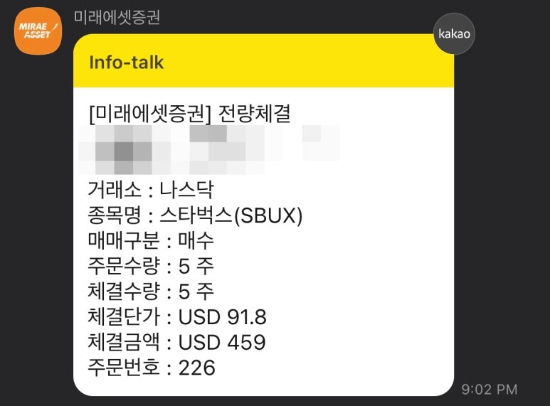 11월 월급을 받은 기념으로 저녁6시 정도에 애플 주식 5주를 매수한 뒤 남은 현금으로 스타벅스 주식을 주당 $91.8에 5주를 매수하였습니다^^
