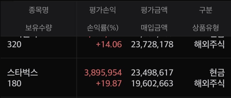 2022년 11월 7일 기준으로 스타벅스 수익률은 19.87%이고