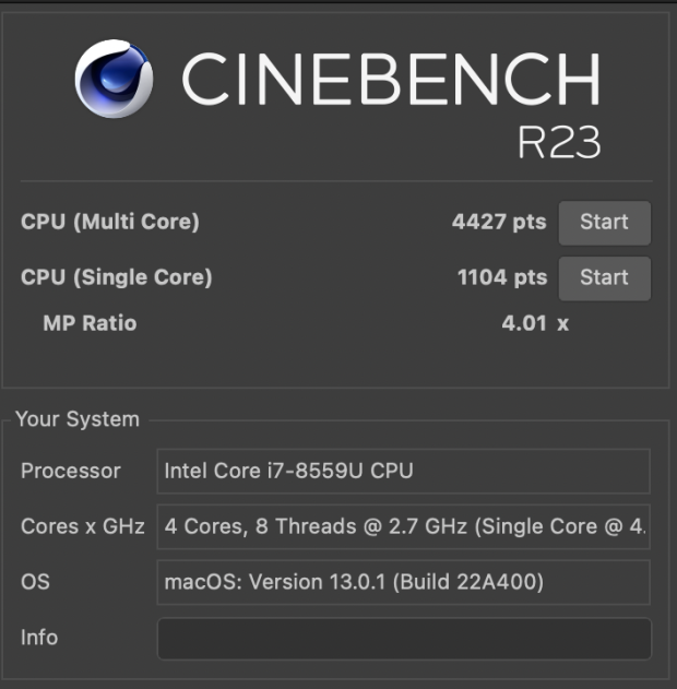 써멀패드 부착 후 Cinebench를 돌려본 결과 Multi Core 4427, Single Core 1104을 기록하여 대략 10%정도의 성능 상승을 확인하였습니다~^^
