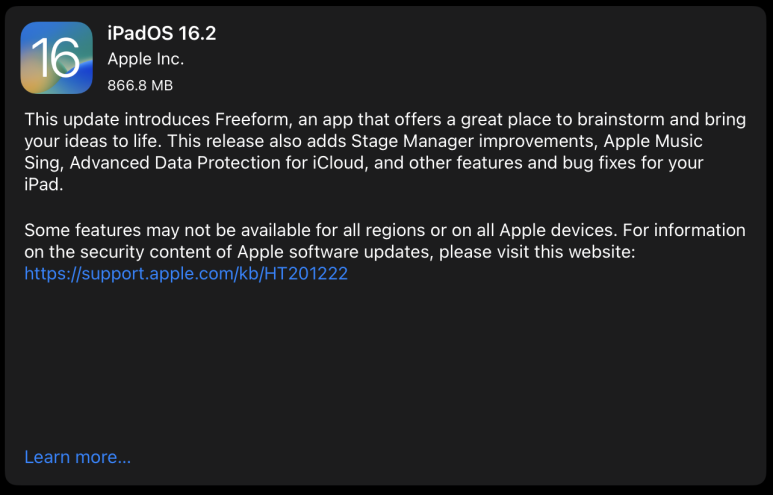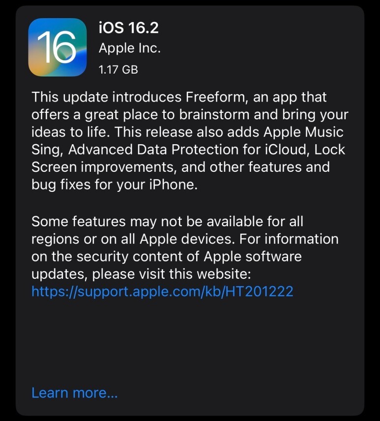 아이폰은 iOS16.2, 아이패드는 iPadOS 16.2 버전으로 업데이트 크기는 1.17GB (아이폰13 프로 기준), 866MB(2018 아이패드 프로기준)이며