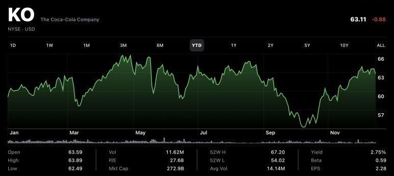 2022년 10월 4일 기준으로 코카콜라 주가는 $63.11이고,