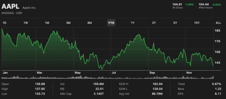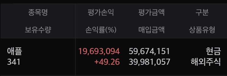 2022년 11월 7일 기준으로 애플 주식 수익률은 49.26%이고