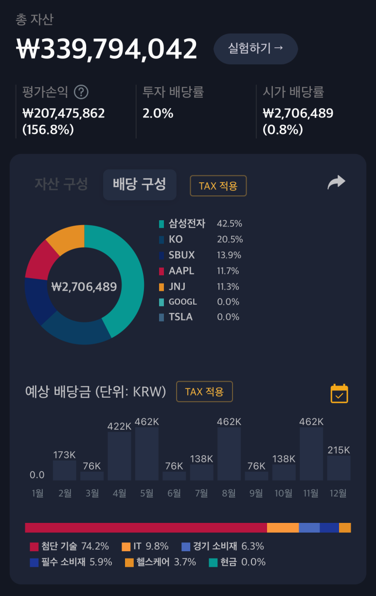 구글은 200주 중 30주를 매도하여 연 250만원 해외비과세 세금면제 기준을 넘지않도록 하고 배당종목에 투자하였습니다.