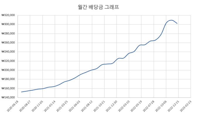 포트폴리오 조정과 매달 꾸준한 배당주 매수로 2022년 연간 배당금은 약 270만원에서 약 360만원으로 증가하였고, 이는 매달 평균 약 22만원에서 30만원으로 증가한 결과로 이어졌습니다~!