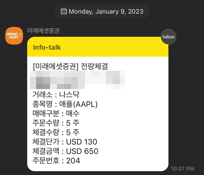 1월 월급을 받은 기념으로 애플 주식을 4주 매수를 하고 추가매수를 어떤 주식으로 할 지 고민을 한 끝에 애플 주식 5주를 추가매수하기로 결정을 해서, 오늘 주당 $130불에 5주를 매수하였습니다^^