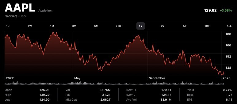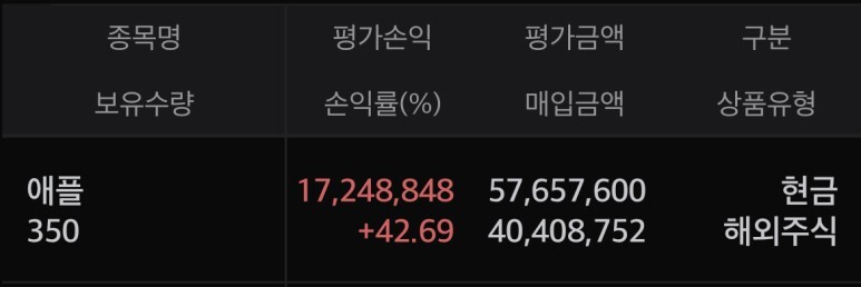 2023년 1월 9일 기준으로 애플 주식 수익률은 42.69%이고