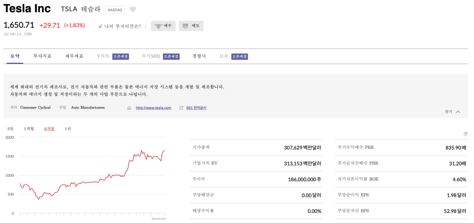 2020년 2분기 기준으로 테슬라 ROE는 4.28%이지만 이전까지 꾸준히 ROE가 마이너스를 기록한 것을 보면 이제 막 흑자가 났다고 봐도 무방합니다.
