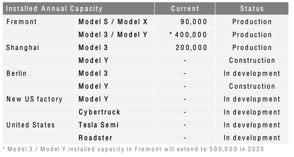 모델 Y: 공장 당 연간 250,000대 생산 (2분기 리포트 끝에 2020년까지 모델3/Y 생산량을 500,000대를 넘을 것이라는 문구가 있어 절반씩 반영했습니다)