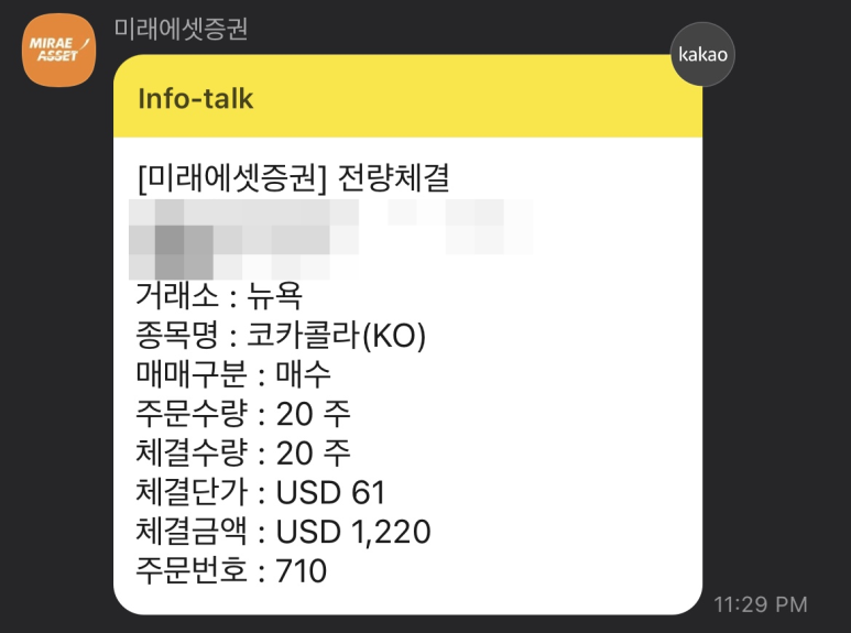 코카콜라 주식 1주당 $0.44의 배당금이 지급됨으로 분기별로 $154 (세전 기준)의 배당금 수령이 가능해졌습니다^^
