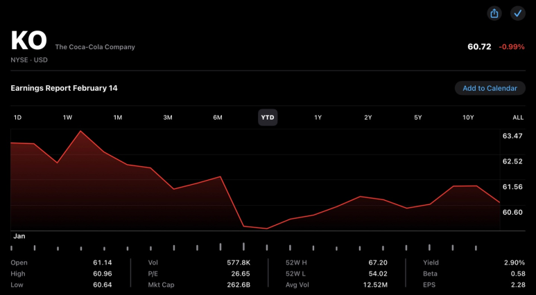 2023년 2월 2일 기준으로 코카콜라 수익률은 14.7%이고