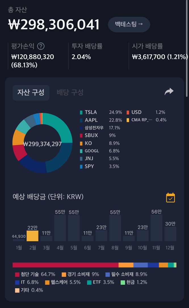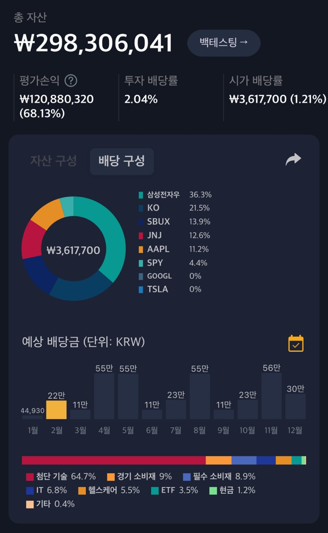 해서, 지난 1년 동안 배당주 집중매수 및 포트폴리오 조정한 결과 현재 기술주 비중이 70% 정도로 낮아졌으며