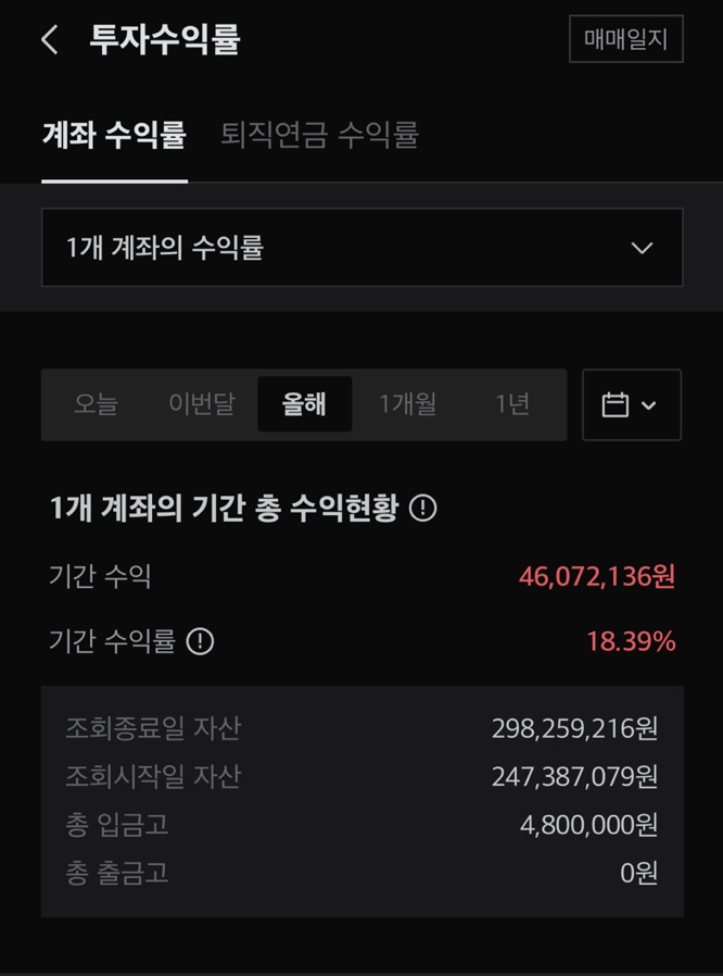 올해 누적 저축액은 4,800,000원, 누적 수익률은 18.39%으로 46,072,136원의 수익을 올리고 있습니다~