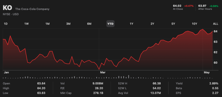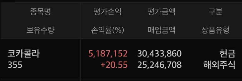 2023년 5월 6일 기준으로 코카콜라 수익률은 20.55%이고