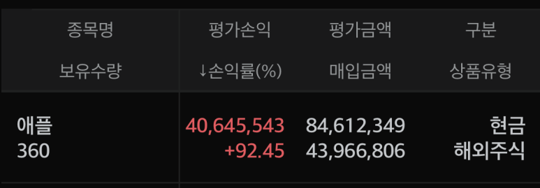 2023년 6월 6일 기준으로 저는 애플를 360주를 보유하고 있으며, 투자 수익률은 92.45%이고, 연간 배당금은 0.53% 입니다~!