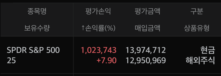 동일 기준으로 SPDR S&P 500는 25주를 보유하고 있으며, 투자수익률은 7.9%이고, 연간 배당금은 1.55% 로 배당률이 높은 종목이 아니라 미국시장추종ETF와 제가 좋아하는 기술주를 투자했습니다^^